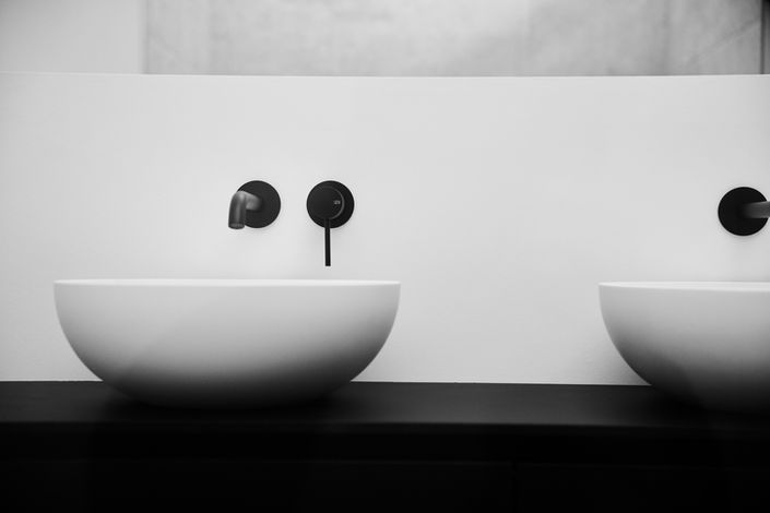 Bäder: Hochwertige Natursteinoptik, elegantes Bad-Design mit italienischen Gessi-Armaturen, neoro-Aufsatzwaschtischen und maßgefertigten Badmöbeln